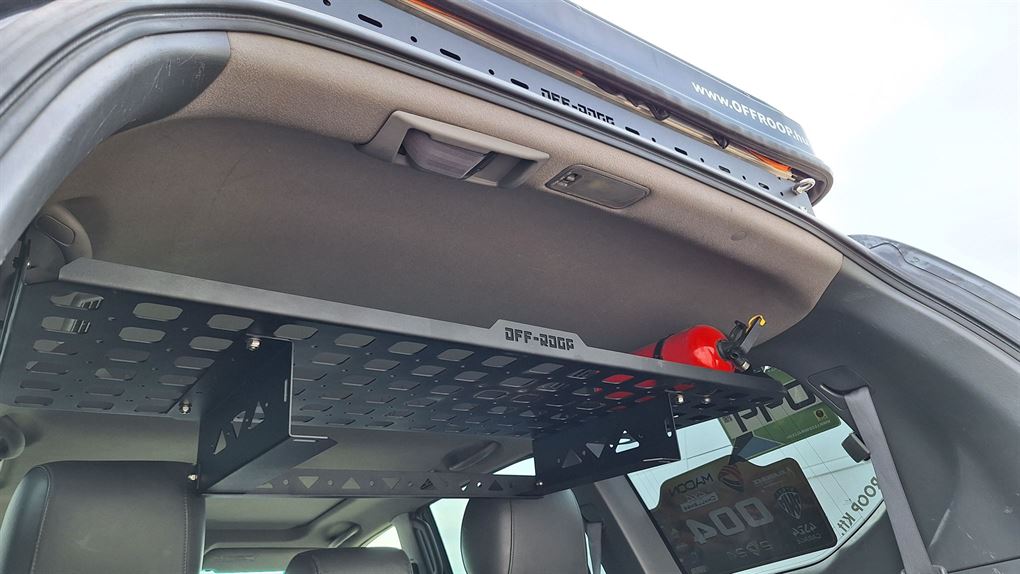 A polc porfestett acélból készül. Land Cruiser Prado 120 gyári pontjaihoz rögzíthető, a harmadik üléssor kapaszkodóinak csavarjaihoz. 5 üléses autó esetén a tetőkárpit alatt megtalálhatók a rögzítéshez szükséges menetes hüvelyek. Két magasságban állítható ezzel támogatja a biztos kilátást és a személyre szabható pakolási méretet.